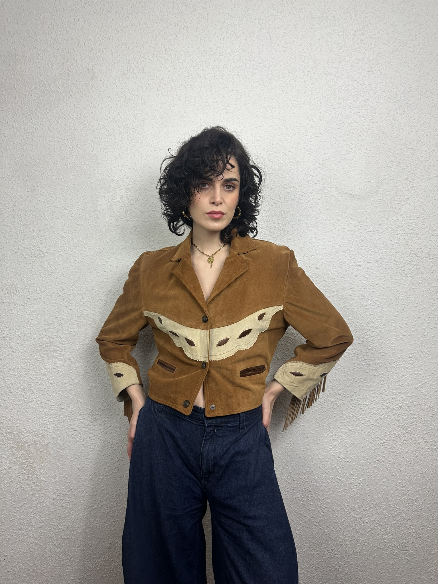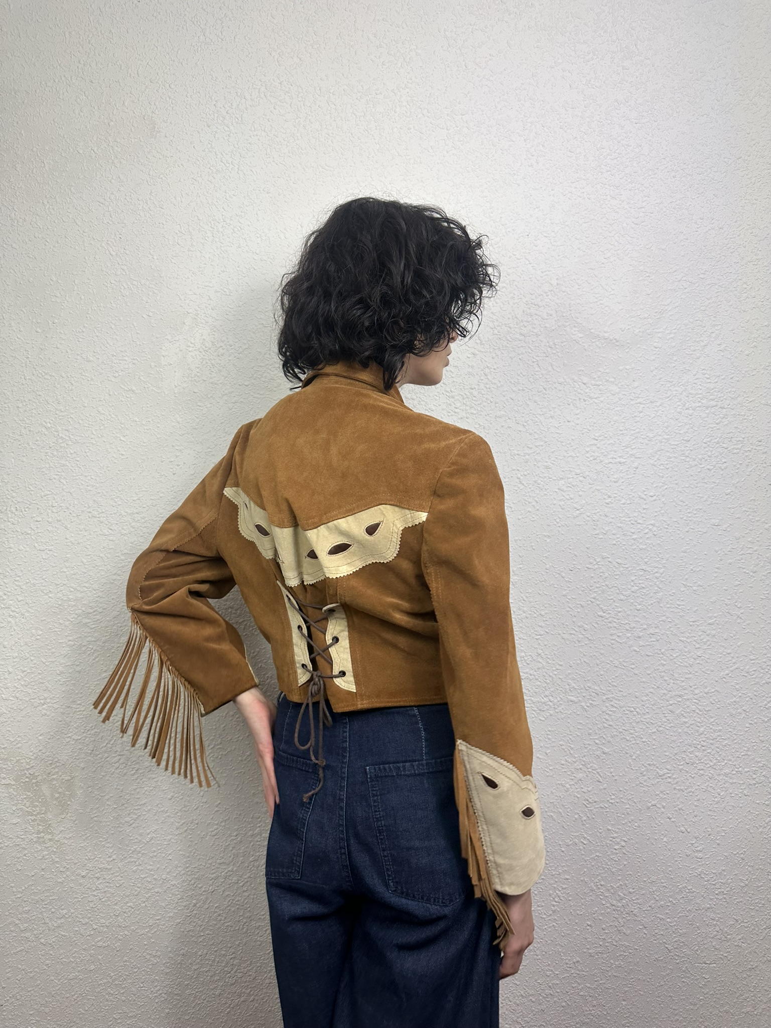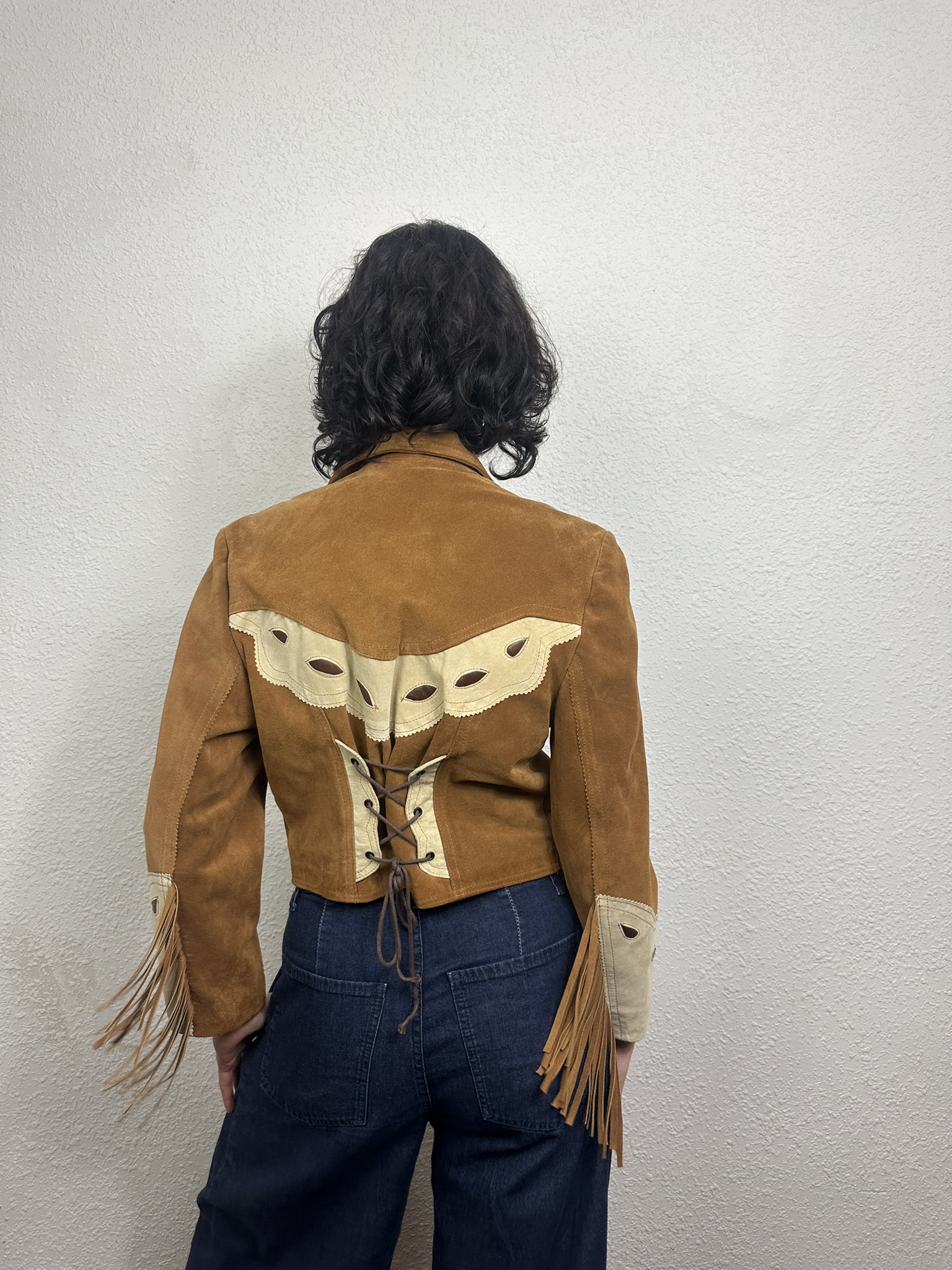 Chaqueta «Western Fringe jacket» genuino vintage de los 70. Diseño inspirado en las prendas funcionales utilizadas por los pioneros del viejo Oeste. Cuello con sopapas, detalles de apliques decorativos a contraste en pecho y mangas, flecos en puños, cierre con botones de presión y espalda muy elaborada con ajustador de cordones en cintura. Pieza perfecta para completar tu look mas «BOHO«.