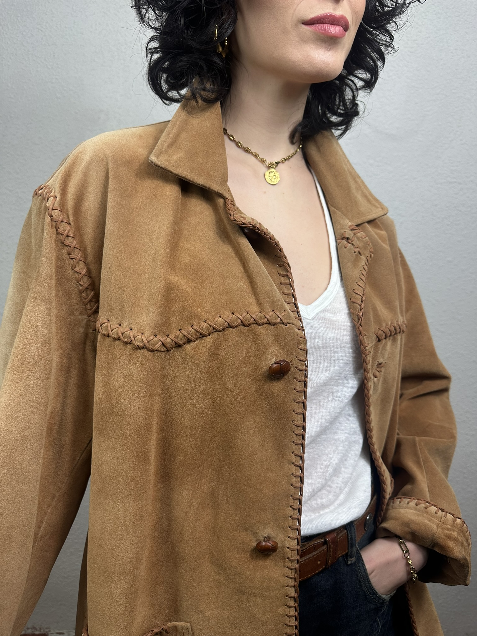 ESTADO: Las prendas vintage pueden presentar efectos y señales propias de su larga vida, señas que forman parte de su historia. La prenda ha desarrollado una patina de desgaste en hombros y mangas con el tiempo que realza su caracter. Higienizada y restaurada al detalle