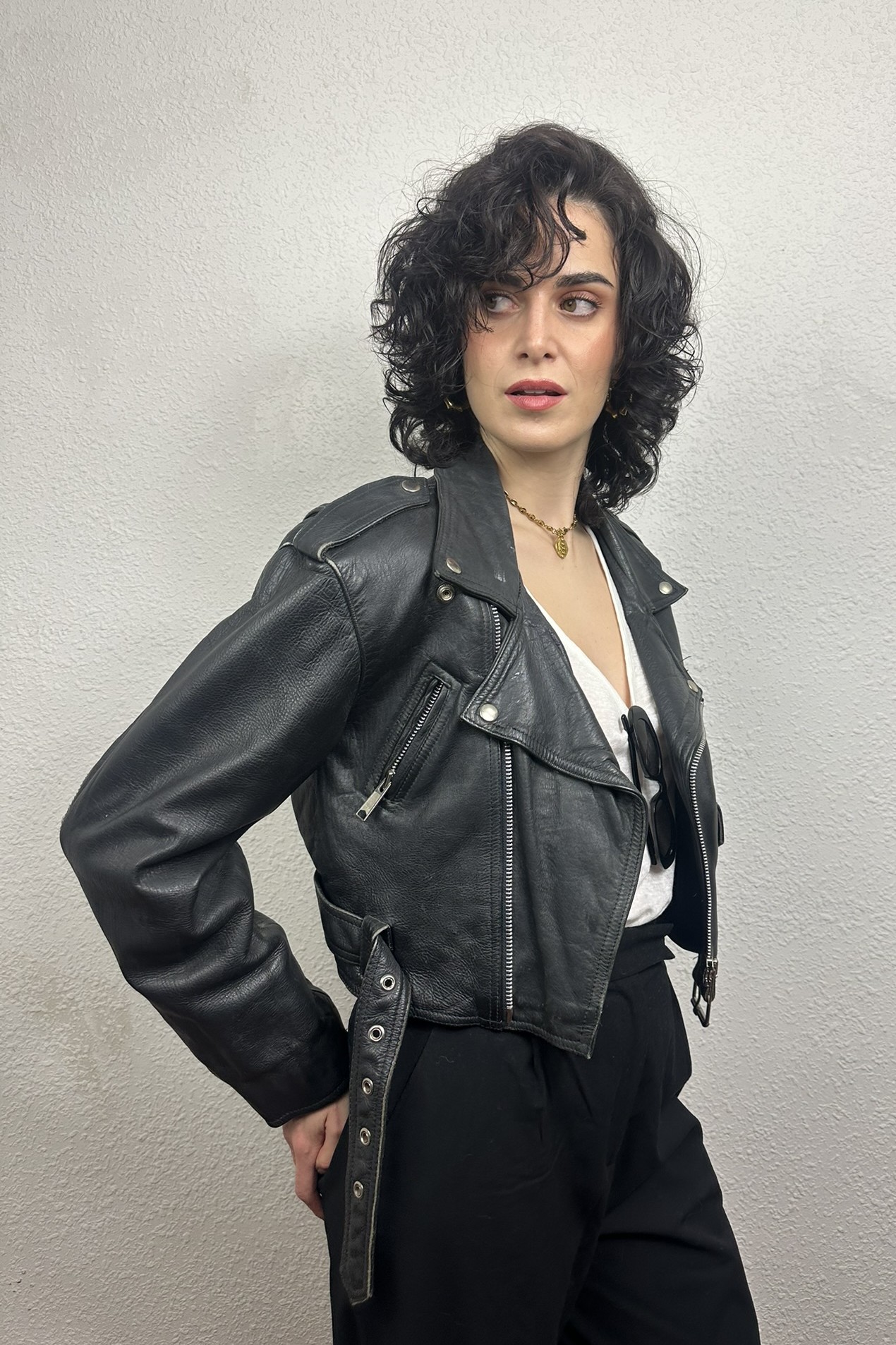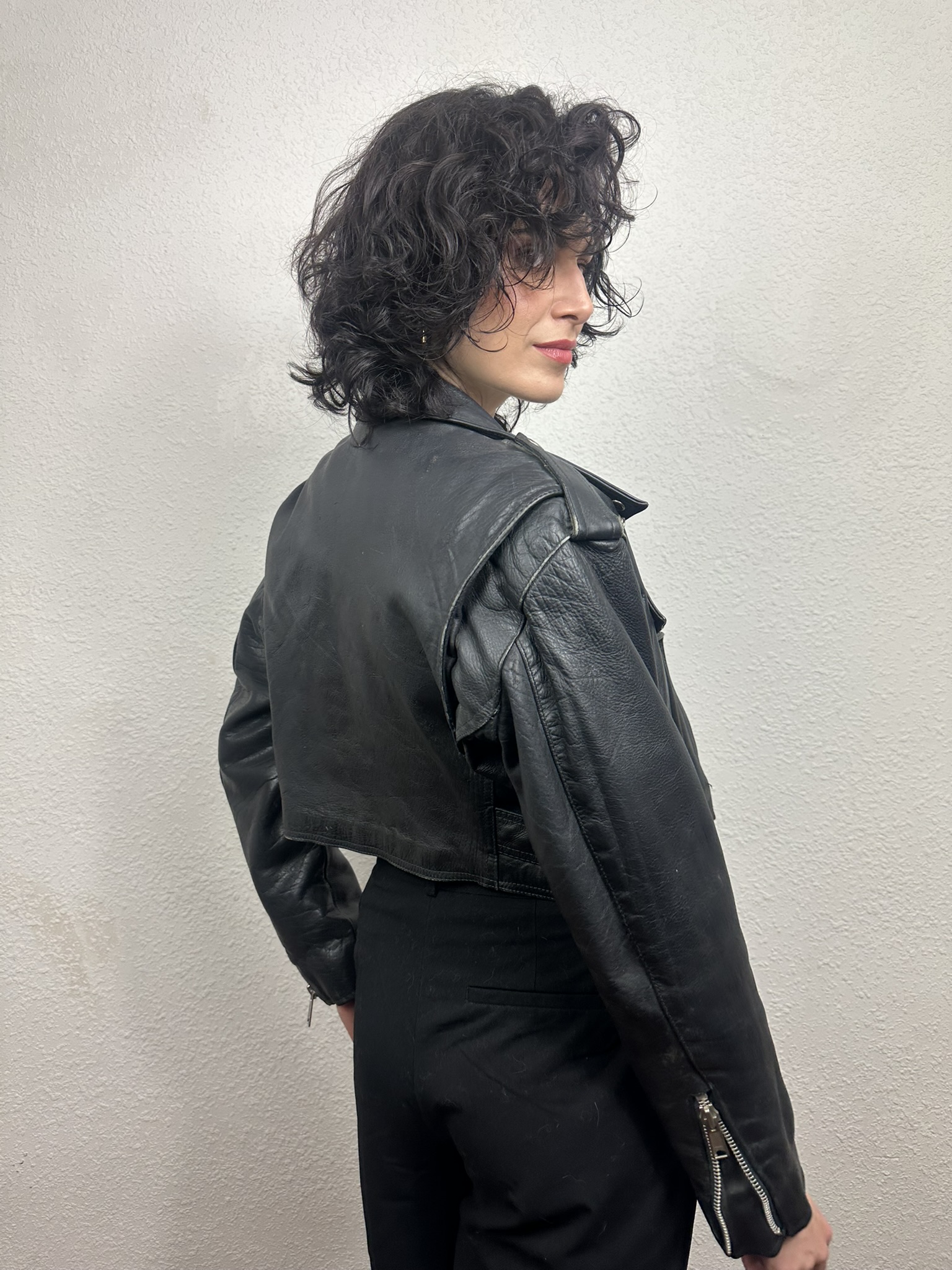 Cazadora de estilo motero «Biker » muy popular en la década de los 80 y 90. Presenta un favorecedor corte «Crooped» y cierre frontal asimétrico con cierre de cremallera metálica, detalles auténticos como cuello de solapa con botones de presión, múltiples bolsillos con cremallera, charreteras en hombros y cinturón con hebilla en cintura para un ajuste perfecto.