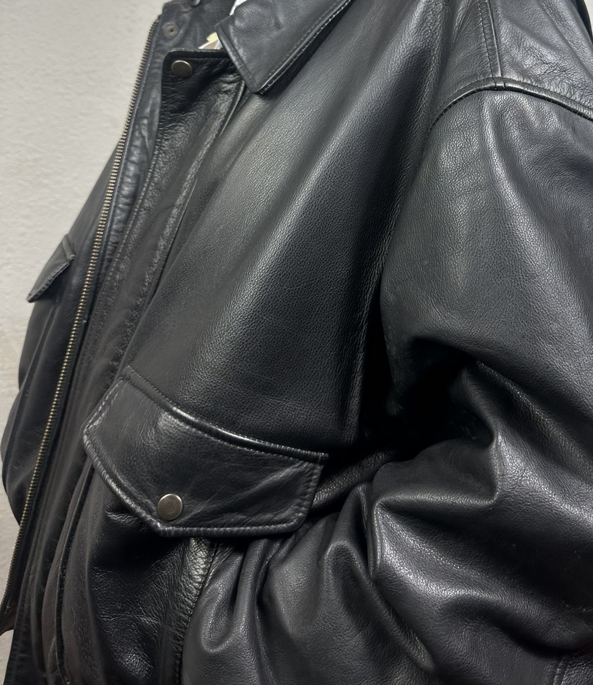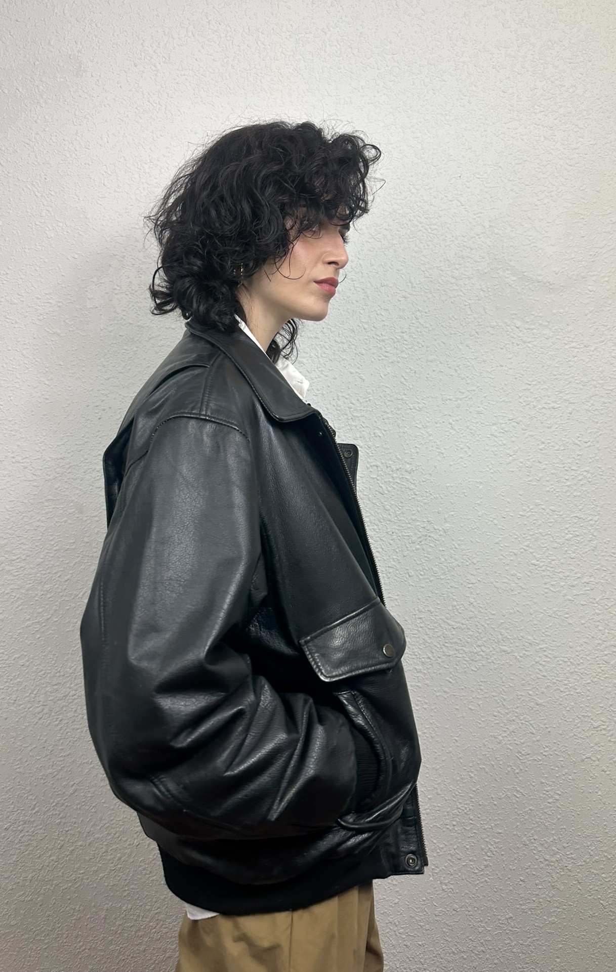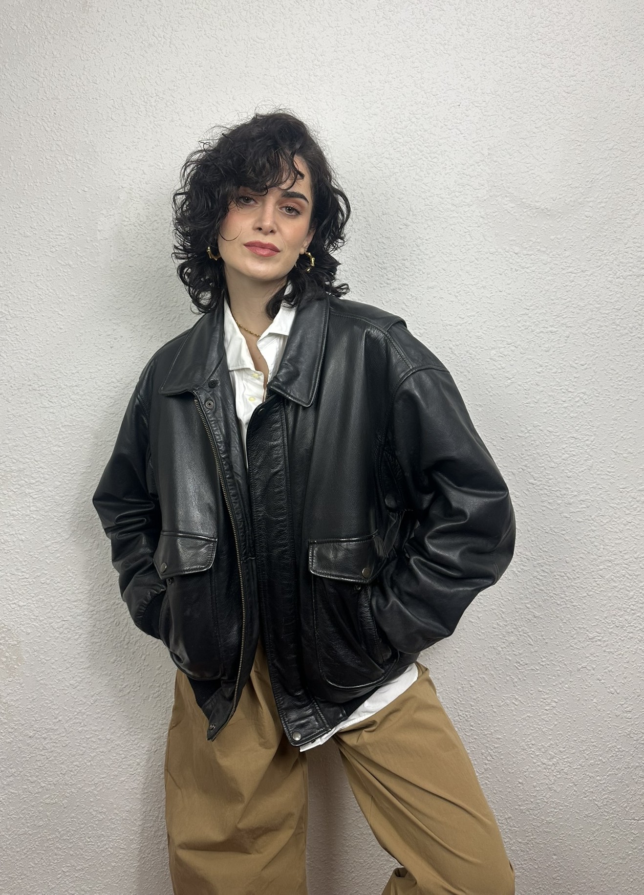 Chaqueta «bomber» negra. Todo un clásico vintage de la década de los 90. Modelo también conocida como «chaqueta de aviador», su diseño se inspira en las prendas utilizadas por los pilotos de mediados del siglo XX.