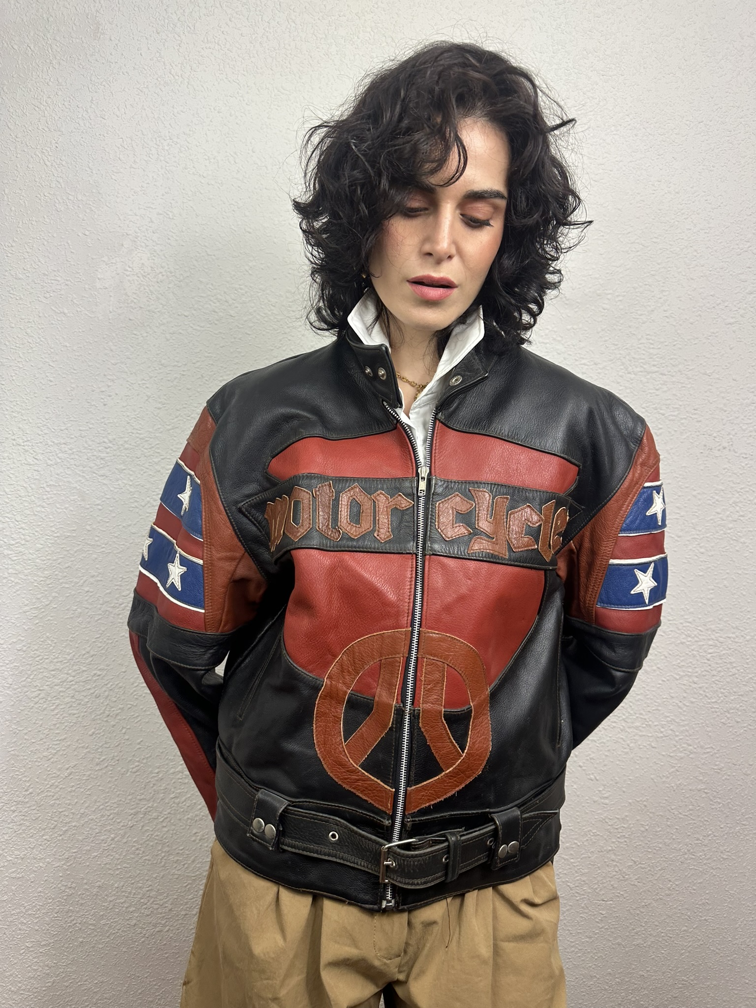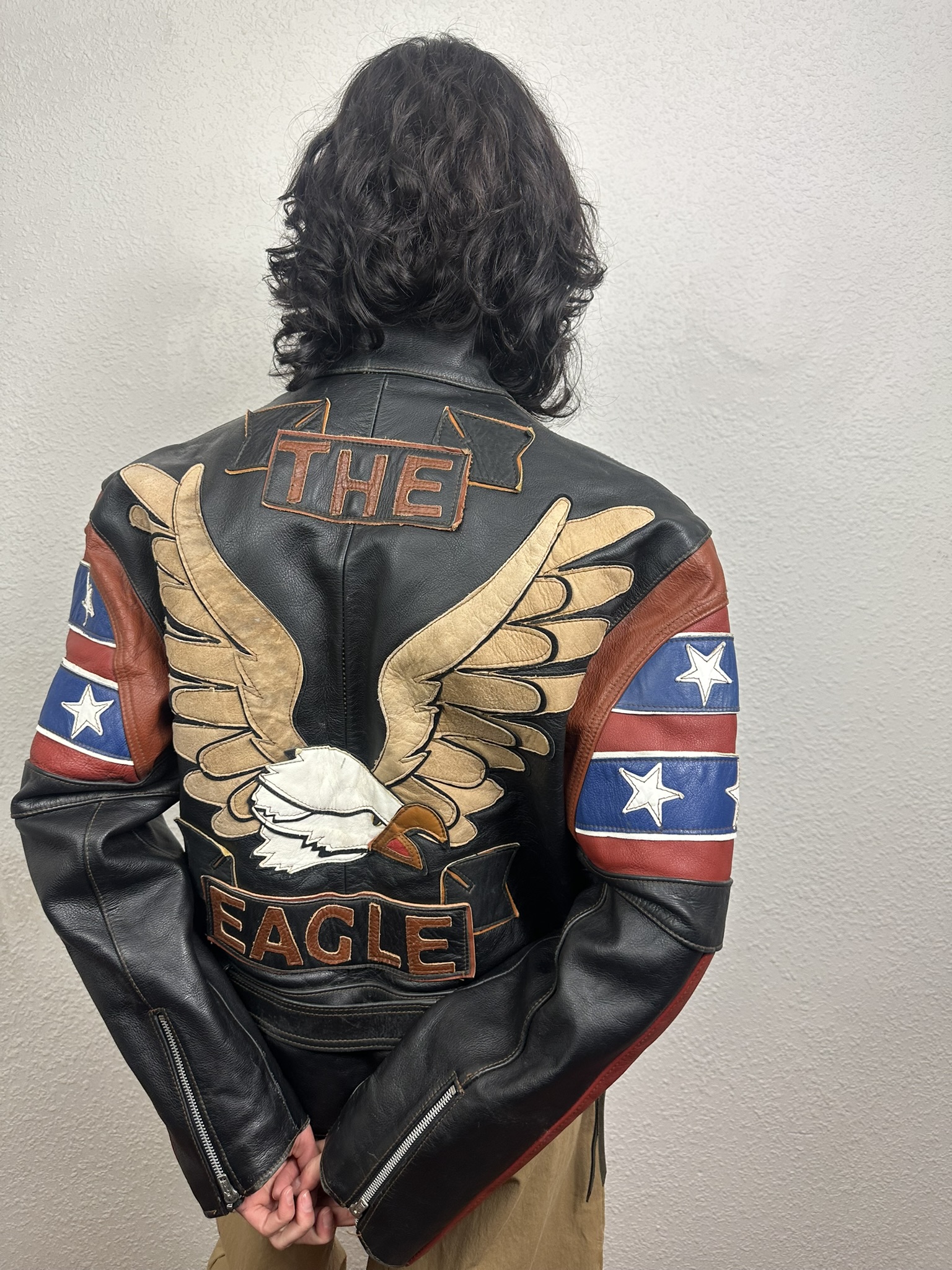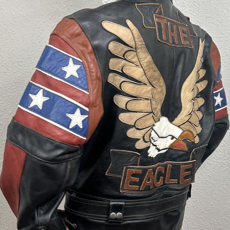 Cazadora «Biker» estilo «Live to Rie» / «The Eagle«, con diseño de águila calva y bandera con estrellas, representa a todo un clásico en la cultura motera y el orgullo estadounidense. Un capricho con cuello tira y cierre de botones de presión, cierre con cremallera en delantero / mangas y cinturón para un ajuste perfecto en cintura, forro de poliéster.